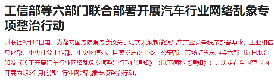 工信部等六部门联合部署开展汽车行业网络乱象专项整治行动。