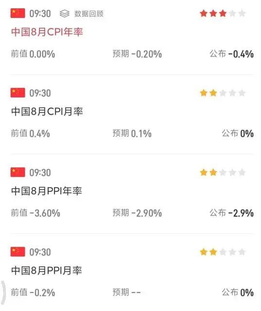 据统计局,8月CPI同比负增长0.4%,弱于市场预期,但核心CPI涨幅连续4个月扩大;PPI同比负增长2.9%,符合市场预期,环比结束连续8个月下行态势。