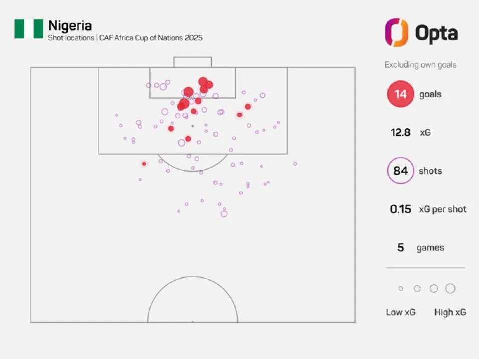 根据OptaJoe的数据统计,尼日利亚在本届五场非洲杯赛事中总计打进14球,这创造了球队在单届非洲杯中的最佳进球纪录,场均2.8个进球是赛事历史上单届参赛场次数超过3场的球队里最高。