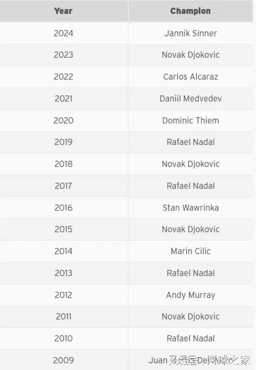 自从2004年和2008年费德勒在美网实现五连冠后,从2009年的德尔波特罗开始,美网的男单冠军便进入了魔咒笼罩时代,在长达16年的时间里无人能够卫冕。原以为今年辛纳能够打破这一僵局,跟萨巴伦卡保持神同步,破解这一魔咒后,从此让男单也迎来全新的格局,可惜最后他失败了。