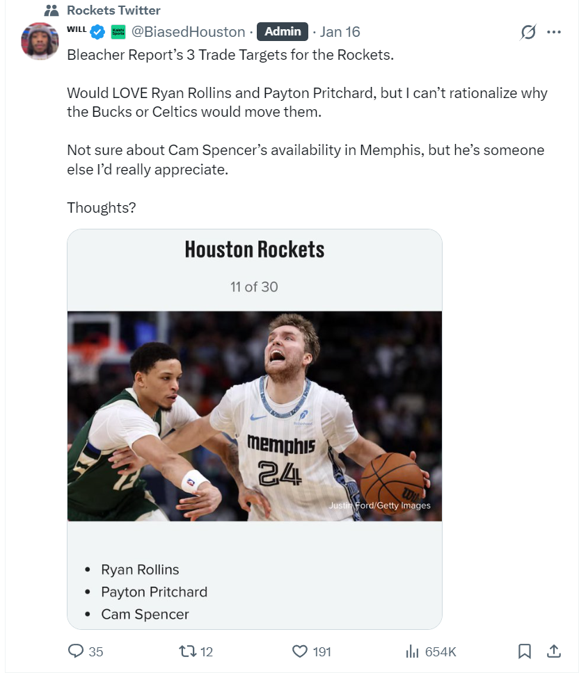 一天之前休媒Will转推了BR的一项交易建议,他认为灰熊队的斯潘塞是火箭补强一号位的不错选择,因为斯潘塞合同非常低廉。