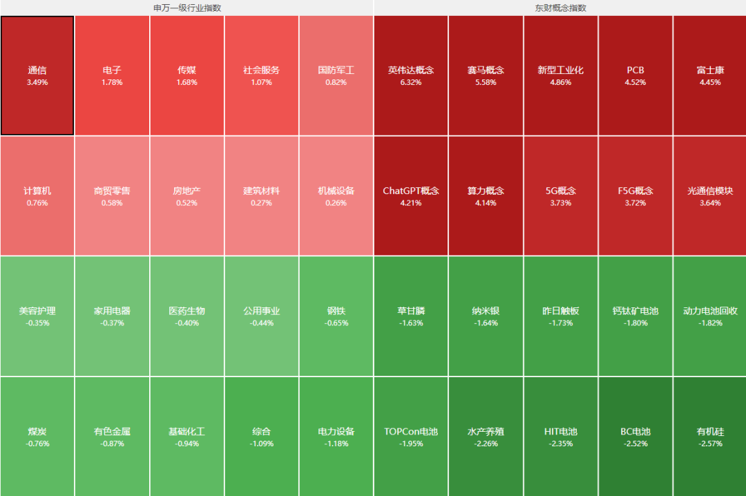 最后简单看下盘面,截至收盘,上证指数涨幅为0.13%,创业板指涨幅为1.27%,港股恒生指数涨幅为1.01%,恒生科技指数涨幅为1.27%。分行业来看,通信、电子、传媒、社会服务、国防军工等行业领涨,电力设备、综合、基础化工等行业领跌。